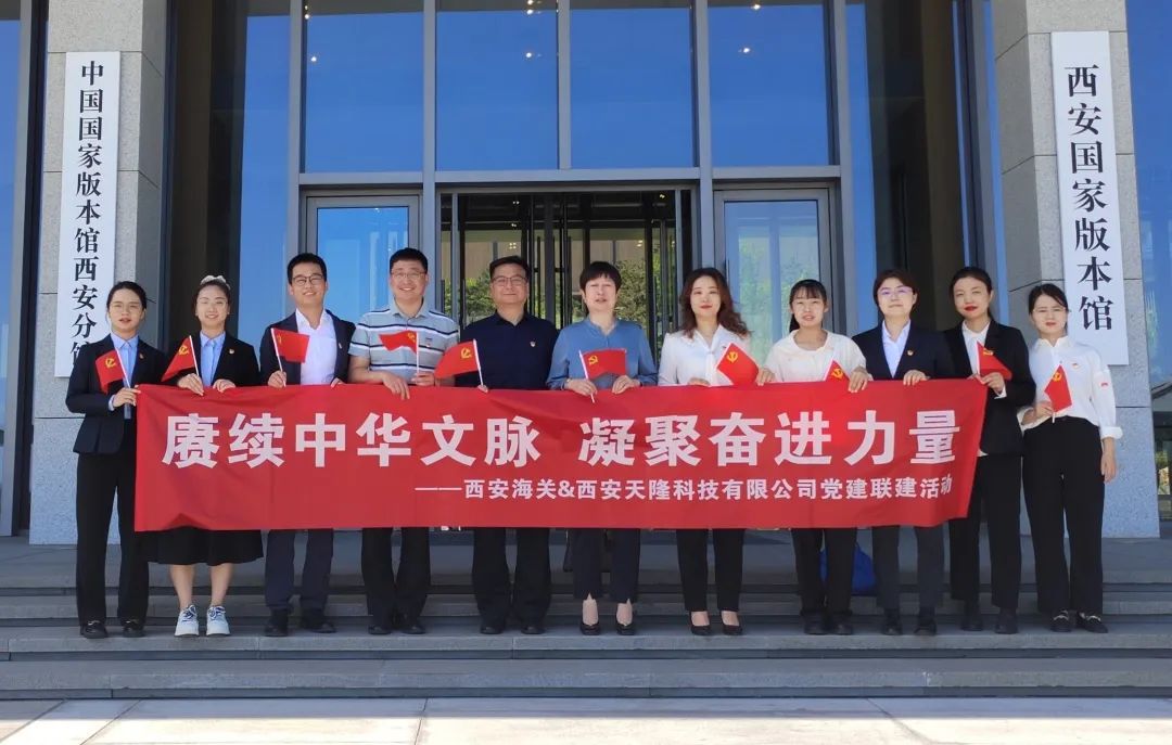 為持續(xù)推動(dòng)學(xué)習(xí)貫徹習(xí)近平新時(shí)代中國(guó)特色社會(huì)主義思想主題教育走深走實(shí),深入學(xué)習(xí)習(xí)近平總書記在文化傳承發(fā)展座談會(huì)上的重要講話精神,加深公司與西安海關(guān)交流合作,鼓勵(lì)全體黨員干部努力在傳承中華優(yōu)秀傳統(tǒng)文化、賡續(xù)中華文明薪火中展現(xiàn)責(zé)任擔(dān)當(dāng)。4月26日上午,西安天隆黨支部組織黨員代表同西安海關(guān)黨員代表共赴西安國(guó)家版本館開展“賡續(xù)中華文脈,凝聚奮進(jìn)力量”黨建聯(lián)建活動(dòng)。
